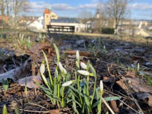 Prim hraje něžná sněženka podsněžník, která už zdobí různé kouty parku svou bílou krásou.
